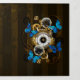 Composition of round steampunk clock with black Roman numeral dial, decorated with gold and brass gears, blue Morpho butterflies and damaged lenses on brown striped background. Steampunk style.