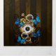 Composition of round steampunk clock with black Roman numeral dial, decorated with gold and brass gears, blue Morpho butterflies and damaged lenses on brown striped background. Steampunk style.