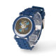 Composition of round steampunk clock with black Roman numeral dial, decorated with gold and brass gears, blue Morpho butterflies and damaged lenses on brown striped background. Steampunk style.