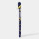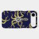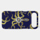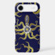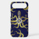 This tentacled steampunk sea monster has eight wire-like gold appendages, a central silver gear and plenty of gears and bolts making up its head, eyes and suction cups. It's a robot octopus / kraken, a metal machine monster for anyone who likes geeky science-fiction / fantasy creatures. On this phone case, tentacles also reach inward from the corners. The background is deep blue.