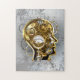 Conceptual, mechanical, human head with antique manometer and metal gears against grey industrial background. Steampunk style.