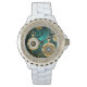 Jewellery, gold watch with a gold chain and keys on a green textural background. Steampunk style.