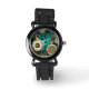 Jewellery, gold watch with a gold chain and keys on a green textural background. Steampunk style.