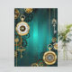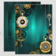 Jewellery, gold watch with a gold chain and keys on a green textural background. Steampunk style.