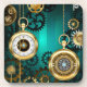 Jewellery, gold watch with a gold chain and keys on a green textural background. Steampunk style.