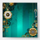 Jewellery, gold watch with a gold chain and keys on a green textural background. Steampunk style.