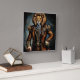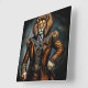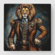 This is a digital art image of a steampunk lion. The lion is wearing a brown leather jacket with gold buttons, a vest and tie. The lion is a symbol of strength, courage, and power. In steampunk culture, it also represents the ingenuity and creativity of the human spirit. The lion in this image is a testament to the power of technology and the human imagination.