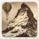 A Steampunk style hot air balloon floats across the Matterhorn mountain. Digital art in sepia