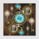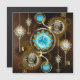 Turquoise lenses with an antique watch with brass gears and golden keys on rusty, brown background. Steampunk style.