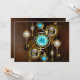 Turquoise lenses with an antique watch with brass gears and golden keys on rusty, brown background. Steampunk style.