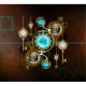 Turquoise lenses with an antique watch with brass gears and golden keys on rusty, brown background. Steampunk style.