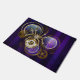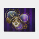 Steampunk spider made of gold and steel with antique watches decorated with gold gears on purple, striped, textured background with lenses and brass gears. Steampunk style.