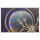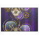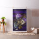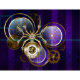 Steampunk spider made of gold and steel with antique watches decorated with gold gears on purple, striped, textured background with lenses and brass gears. Steampunk style.