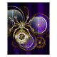 Steampunk spider made of gold and steel with antique watches decorated with gold gears on purple, striped, textured background with lenses and brass gears. Steampunk style.