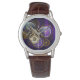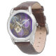 Steampunk spider made of gold and steel with antique watches decorated with gold gears on purple, striped, textured background with lenses and brass gears. Steampunk style.