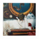White furry steampunk cat wearing his cute brown top hat and goggles. The cat is sitting on a counter top in the ship's kitchen waiting for his tea time. Behind him is the ship's window that has an octopus passing by.