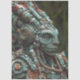 The unique design is of a highly detailed mechanical or robotic head that resembles a human face. It is adorned with various gears, pipes, and mechanical components, all intricately designed. The predominant teal color scheme is accented with hints of orange and rust, giving the piece an aged or steampunk aesthetic. The background is blurred to focus attention on the mechanical head, emphasizing its complexity and craftsmanship.
