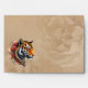 Steampunk Tiger with Roses Illustration. The image features a close-up of a tiger's head in profile, rendered in a digital art style. The tiger has orange and black stripes, with white fur around its face. A steampunk-style metallic spine adorned with gears and roses curves around the tiger's neck. The background is a soft, beige colour with floral patterns. The overall mood is a blend of wildness and mechanical elegance.