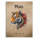 Steampunk Tiger with Roses Illustration. The image features a close-up of a tiger's head in profile, rendered in a digital art style. The tiger has orange and black stripes, with white fur around its face. A steampunk-style metallic spine adorned with gears and roses curves around the tiger's neck. The background is a soft, beige colour with floral patterns. The overall mood is a blend of wildness and mechanical elegance.