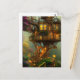 Beautiful postcard created using AI rendering software features a Steampunk style treehouse and observatory with domed rooms and round windows.