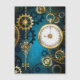 Turquoise, textured, steampunk background with brass and gold gears, a silver key and the clock. Steampunk style.