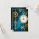 Turquoise, textured, steampunk background with brass and gold gears, a silver key and the clock. Steampunk style.