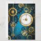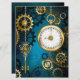Turquoise, textured, steampunk background with brass and gold gears, a silver key and the clock. Steampunk style.