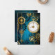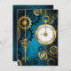Turquoise, textured, steampunk background with brass and gold gears, a silver key and the clock. Steampunk style.