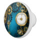 Turquoise, textured, steampunk background with brass and gold gears, a silver key and the clock. Steampunk style.