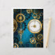 Turquoise, textured, steampunk background with brass and gold gears, a silver key and the clock. Steampunk style.