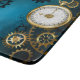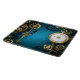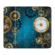 Turquoise, textured, steampunk background with brass and gold gears, a silver key and the clock. Steampunk style.