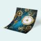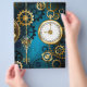 Turquoise, textured, steampunk background with brass and gold gears, a silver key and the clock. Steampunk style.