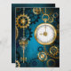 Turquoise, textured, steampunk background with brass and gold gears, a silver key and the clock. Steampunk style.