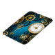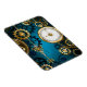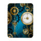 Turquoise, textured, steampunk background with brass and gold gears, a silver key and the clock. Steampunk style.