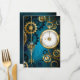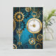 Turquoise, textured, steampunk background with brass and gold gears, a silver key and the clock. Steampunk style.