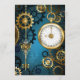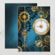 Turquoise, textured, steampunk background with brass and gold gears, a silver key and the clock. Steampunk style.