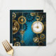 Turquoise, textured, steampunk background with brass and gold gears, a silver key and the clock. Steampunk style.