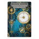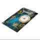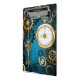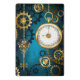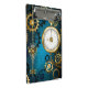 Turquoise, textured, steampunk background with brass and gold gears, a silver key and the clock. Steampunk style.