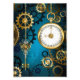 Turquoise, textured, steampunk background with brass and gold gears, a silver key and the clock. Steampunk style.