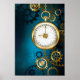 Turquoise, textured, steampunk background with brass and gold gears, a silver key and the clock. Steampunk style.