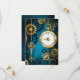 Turquoise, textured, steampunk background with brass and gold gears, a silver key and the clock. Steampunk style.