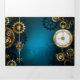Turquoise, textured, steampunk background with brass and gold gears, a silver key and the clock. Steampunk style.