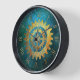 A pair of rusty Steampunk Cogwheels against a vibrant verdigris blue background.
