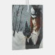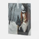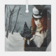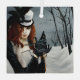 Steampunk victorian red haired woman out on a winter walk to release her dragonfly messenger with a key