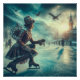 This elegant winter messenger travels along the ice on ice skates in this steampunk Victorian fantasy world towers a tower in this detailed fantasy artwork.