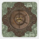 A vintage wedding envelope seal sticker with a distinct Victorian, steampunk look, consisting of green floral wallpaper background, a wooden ship's wheel, gold wedding rings, set against an ornate brown, wrought-iron look decoration.