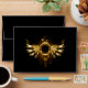 Shiny mechanical wings, with gears and brass round banner. Steampunk