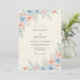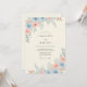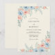 This design showcases a delicate watercolor palette featuring steel blue and peach blossoms. Lush sprigs of eucalyptus and ferns accent the composition, lending a soft botanical feel to the cream background. The ethereal floral arrangement of roses and greenery evokes a romantic and airy atmosphere for a seasonal ceremony.