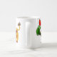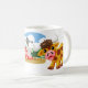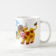 Coffee mug featuring cartoon rooster and steer on a farmstead.