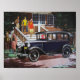 Poster of a vintage 1920s outdoor scene of three people coming out of a house, two people in a black automobile, and two gentlemen standing nearby looking on. See matching wrapped canvas print. See the entire Roaring 20s Poster collection in the DECOR | Wall Art section.